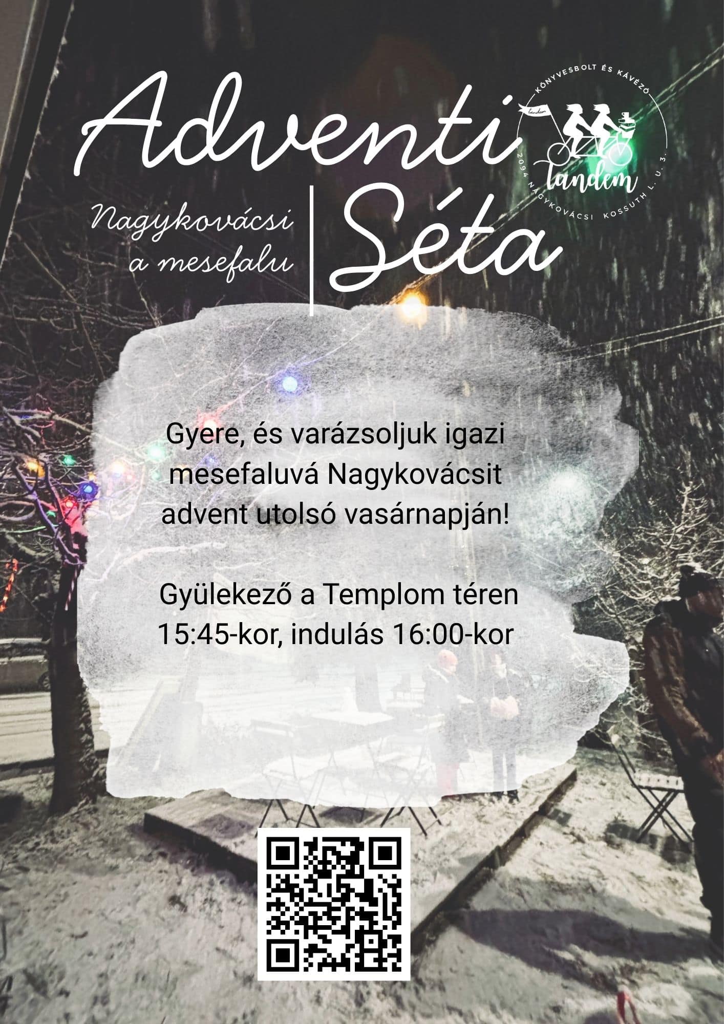 Az adventi séta hagyománya a Covid idején indult, amikor mindannyian vágytunk a kapcsolódásra. A közös, szabadtéri találkozások újra közel hoztak bennünket egymáshoz — idén pedig tovább erősítjük ezt azzal, hogy együtt sétálunk végig a Főutcán, Kósa Emőke vezetésével.